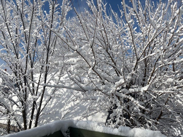 As the snow fell on Sunday night, and after reading your replies to my morning post, I felt my emotions rise. Now I wish I could say more about my dear old ex-husband Jamie who just died with Stage 4 Metastatic Lung Cancer in his bones. But I’m giving him privacy for now. My healing conundrum is that I will grieve his passing while working on the other mysteries in my ALS experience. Once he asked me “when will you write a book about us?” Maybe not a book, but a Substack post at some point.