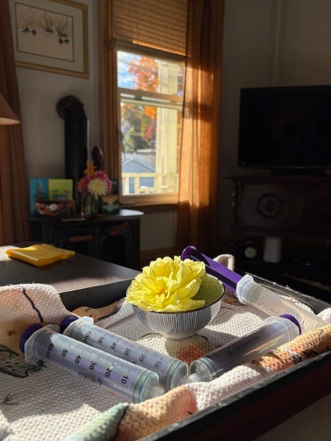 This week, my routine of liquid feedings and meds sapped my energy. I felt a boredom I did not experience when actively traveling with delays, cleaning up the kitchen after dinner parties, raking leaves that never stopped falling in our yard. I’m sorry to repeat how boring it feels never to be able to partake of conversation and espresso salmon with sweet potatoes, and key lime pie; or with head drop, not being able to see people’s faces on the street, in an elevator, entering waiting rooms.
